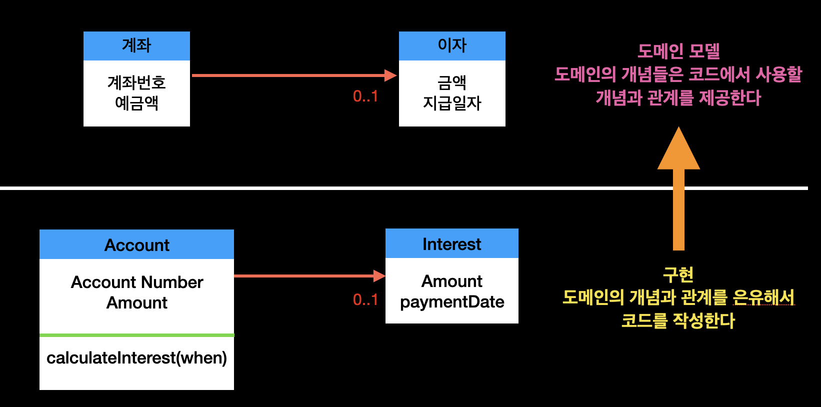 객체지향의 가장 큰 장점은 도메인을 모델링하기 위한 기법과 도메인을 프로그래밍하기 위해 사용하는 기법이 동일하다는 점이다. 따라서 도메인 모델링에서 사용한 객체와 개념을 부드럽게 프로그래밍 설계에서의 객체와 클래스로 변환할 수 있다[연결완전성].