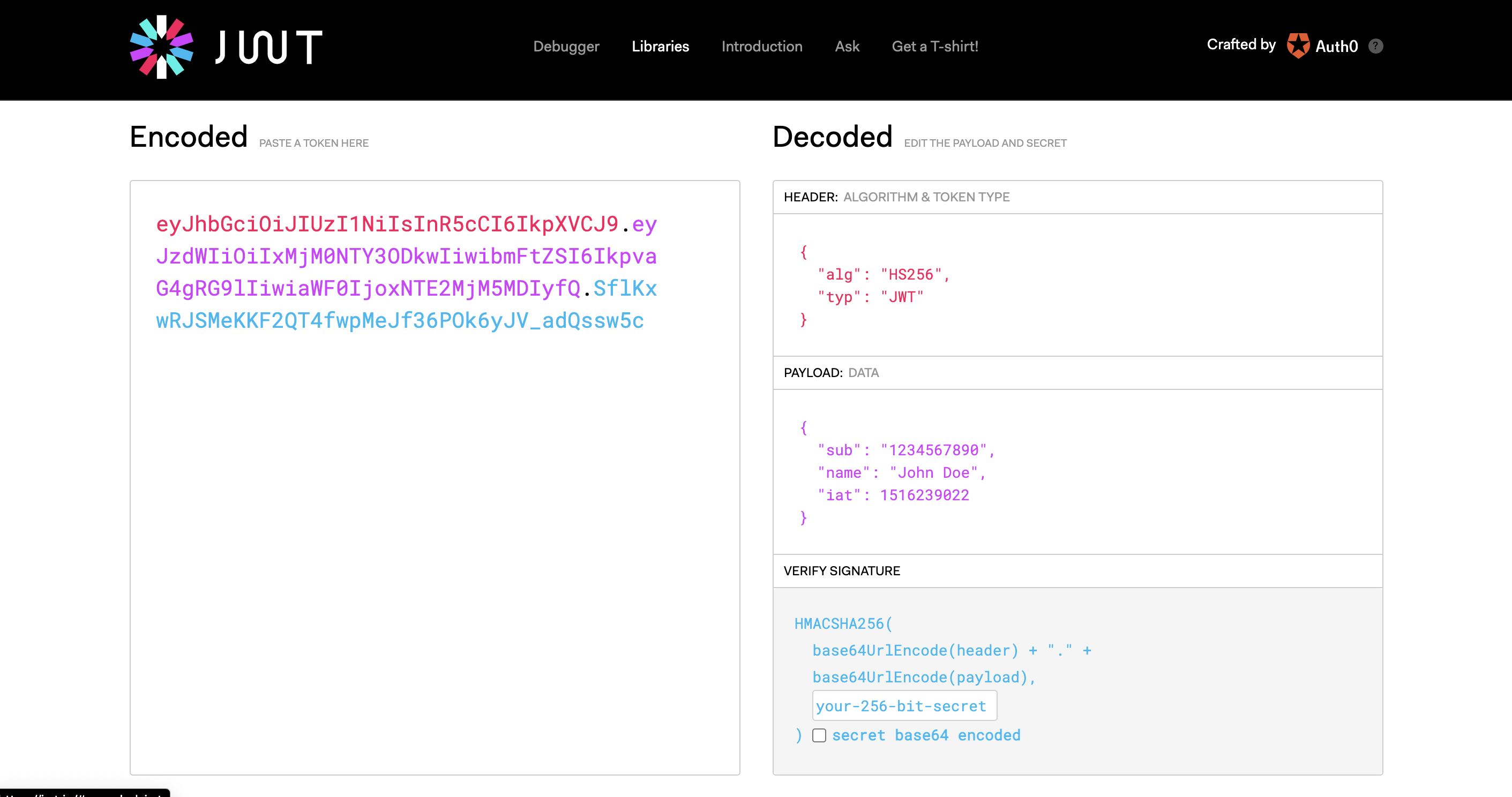 위에 보면 알고리즘은 HS256, 데이터중 이름은 John Doe, 서명은 your-256-bit-secret이라는 키가 들어간 것을 확인할 수 있다.