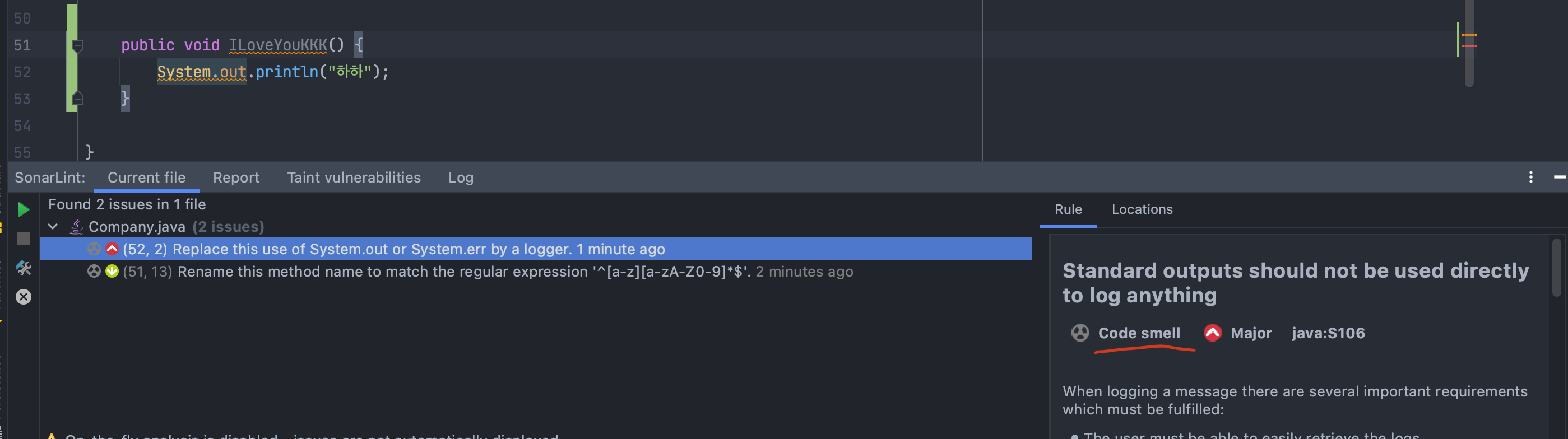 첫번째로 System.out.println으로 쓰지말고 logger로 대신 쓰란다. 가령 @Sl4j같은것.. 으 코드냄새야~!