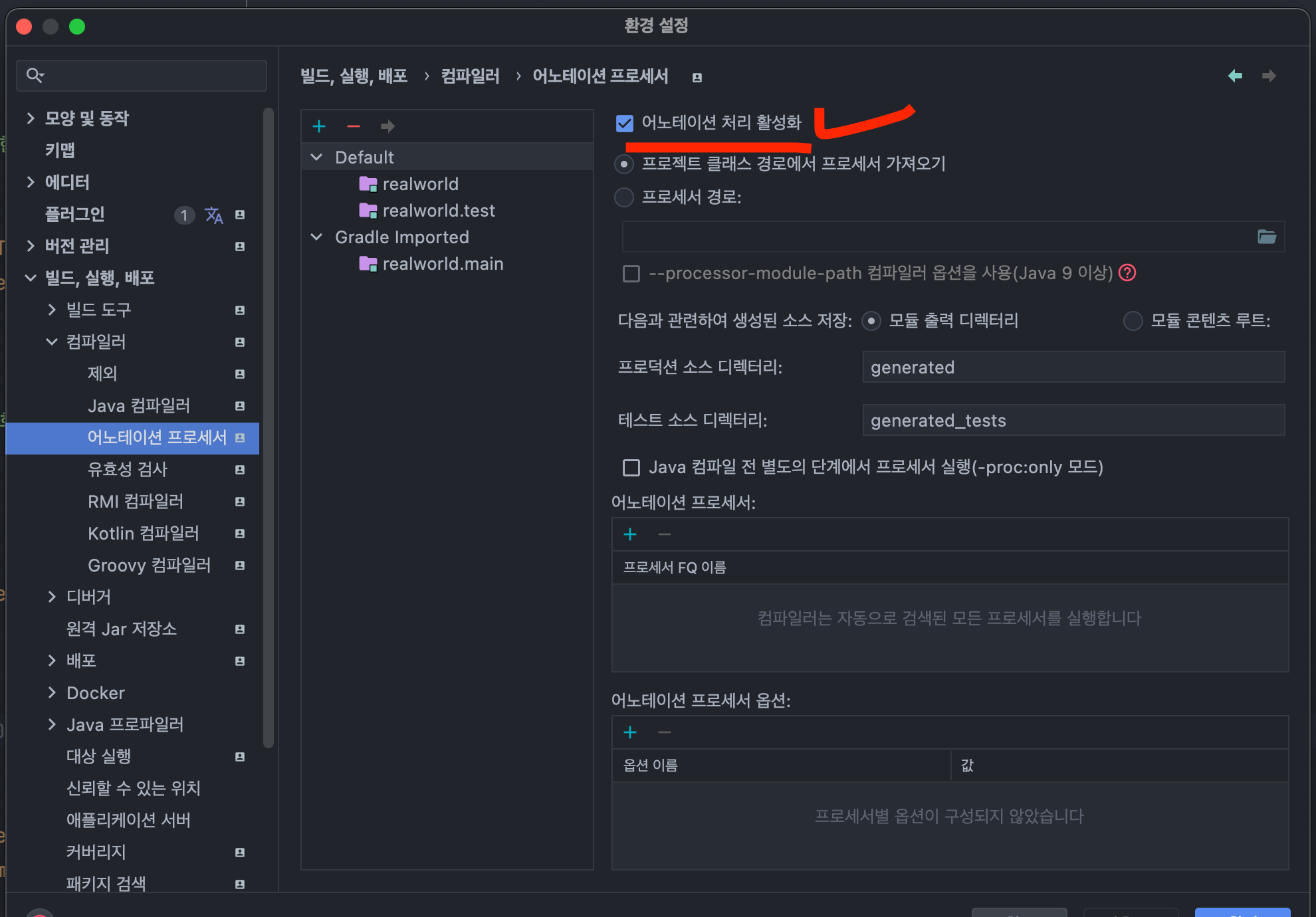 File → Settings → Build, Execution, Deployment → Compliler → Annotation Processors → Enable annotation processing 체크 → 확인