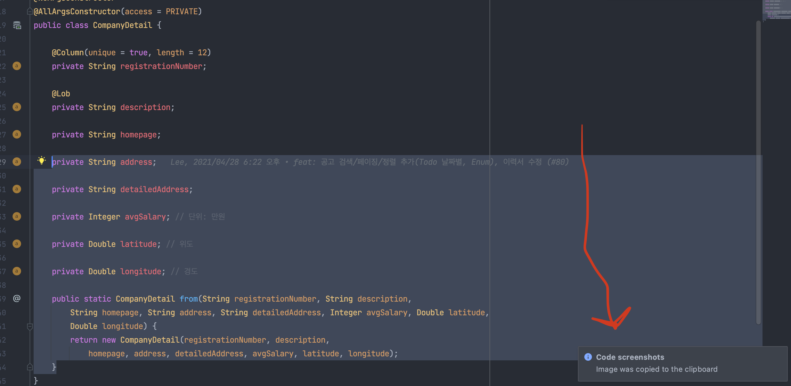 코드를 스크린샷을 찍어주는 플러그인이다. 윈도우 기준 Ctrl + Alt + Shift + A, 맥 기준 Command + Option + Shift + A키다