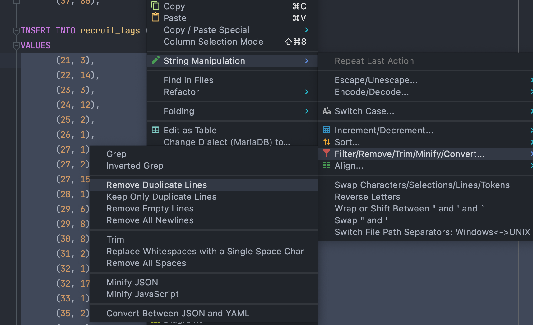 다음으로 유용한 플러그인 두개를 소개하겠다. 문자열 편집기라고 음...나는 data.sql을 수정할때 유용하게 썼다. 중복된 텍스트가 있으면 알아서 삭제시켜주고 자동으로 sort도 시켜준다. 한번 보시면..!!