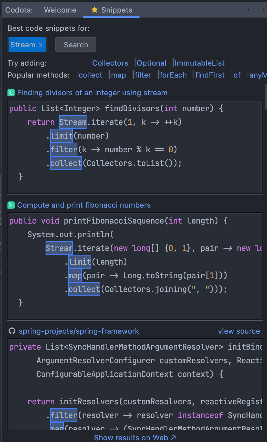 우측 또는 하단에서 생성된 코도타 탭을 눌러서 snippets를 들어가서 원하는 코드를 검색하면 ...!