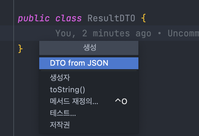 그럼 DTO from JSON이라고 뜨는데 이것을 클릭해주자