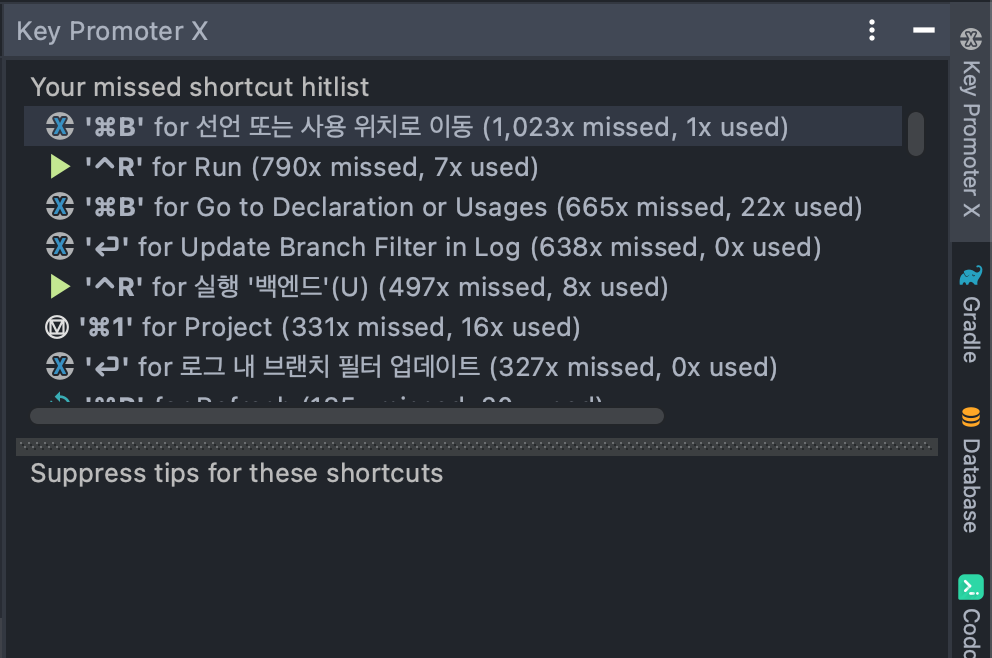 이건 jetBrains의 제품을 쓰는 사람들 중 모르는 사람이 없을 것 같다. IDE내에서 돌아가는 동작 중에서 마우스 행한 동작을 단축키로 알려준다. 방금 행동한 것은 우측하단에 팝업으로 나타내주고, 우측 탭에서 이것을 스택으로 쌓아서 보여준다. 마우스와 멀어지기 위한 첫번째 플러그인이다.