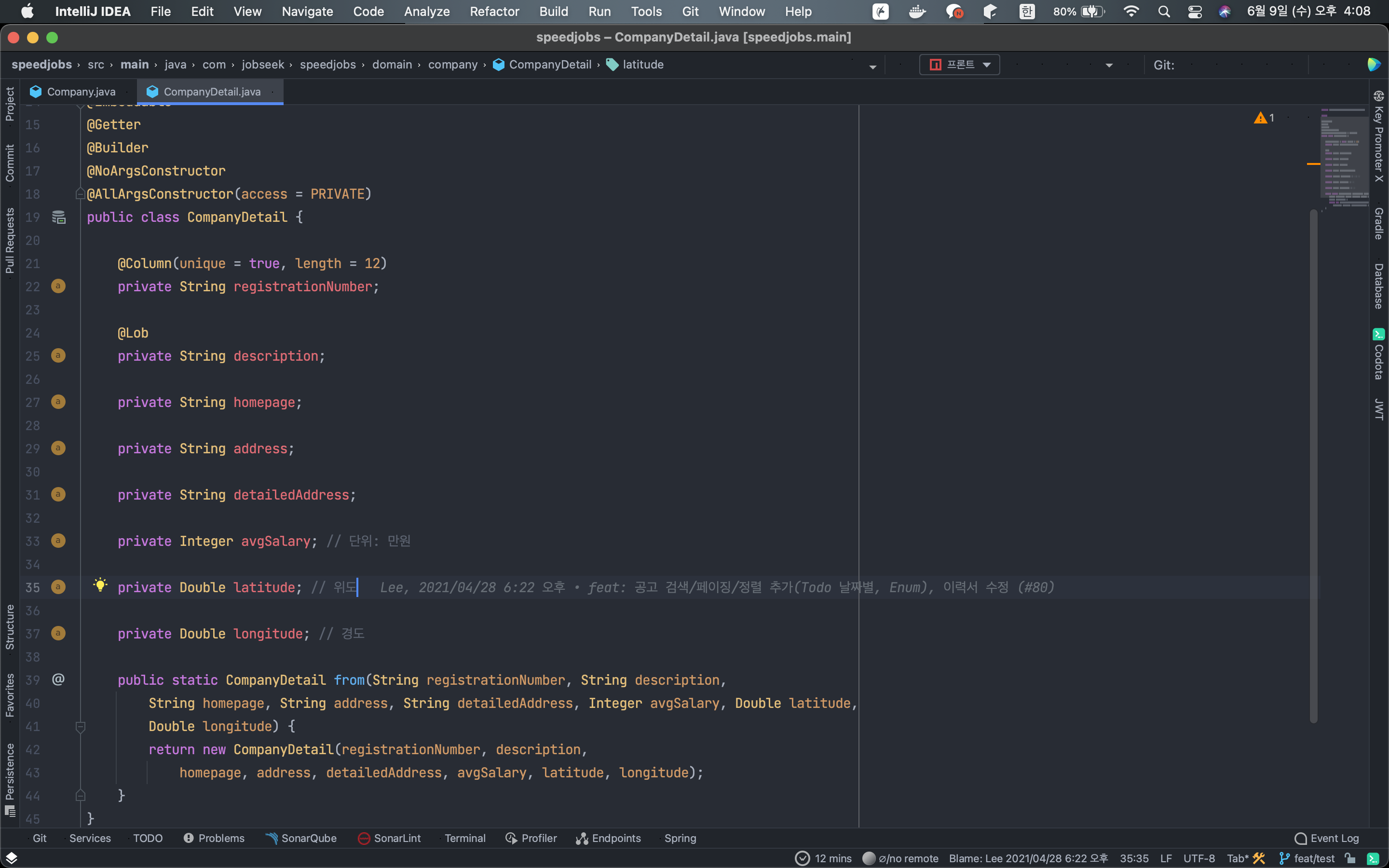 소나린트는 정적코드품질분석도구인 소나큐브에서 쓰이는 문법오류를 인텔리제이 내부의 플러그인으로 미리 보여주게 하는 플러그인이다. 없어도 그만이지만... 당신의 코드에서 bad smell이 나는것보단 낫지않은가? 밑에는 사용 예시이다