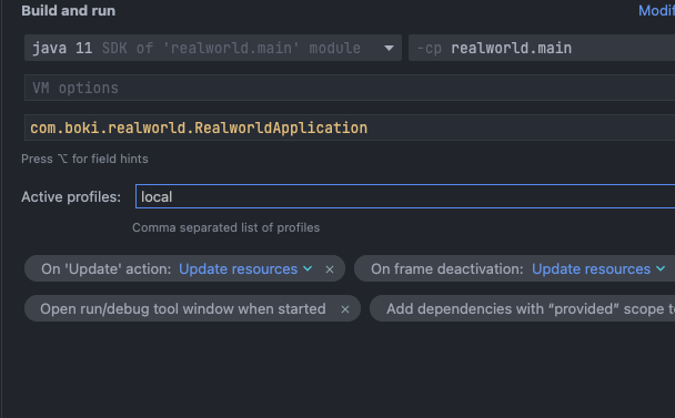 참고로 profiles 설정은 하나의 yaml에 --- 구분자로 여러 profiles들을 입력하는 방법과, 저렇게 여러 파일을 나누는 방법, 그리고 @Profile("dev") 어노테이션 방식, 인텔리제이 Run/Debug Configurations Tab의 속성에서 넣어주는 방법이 있다