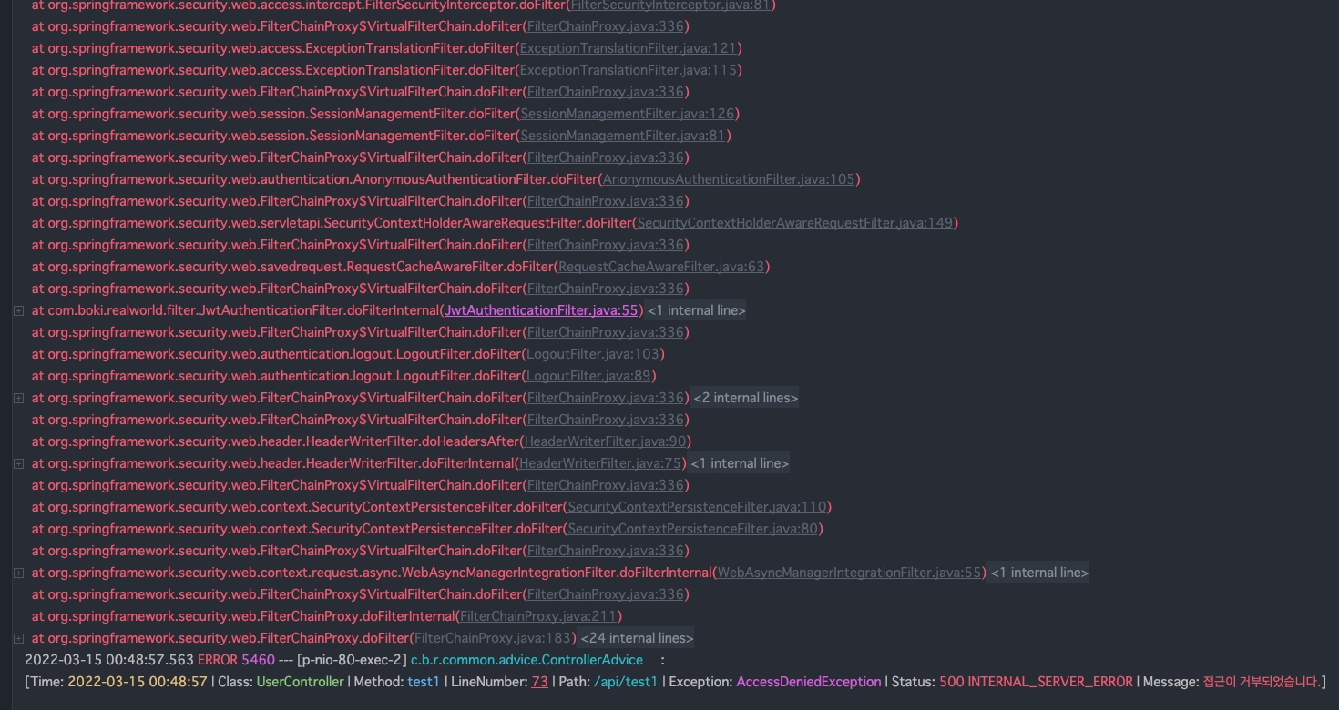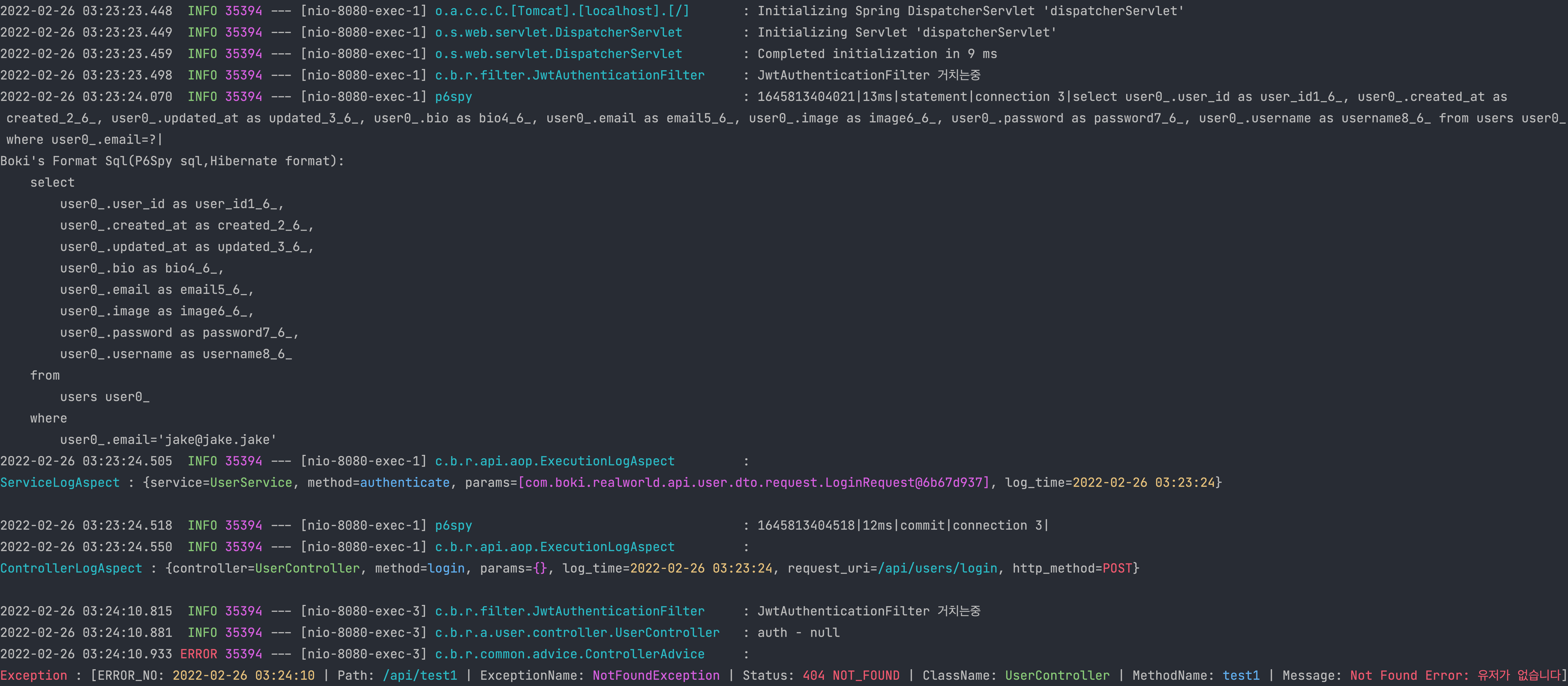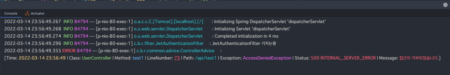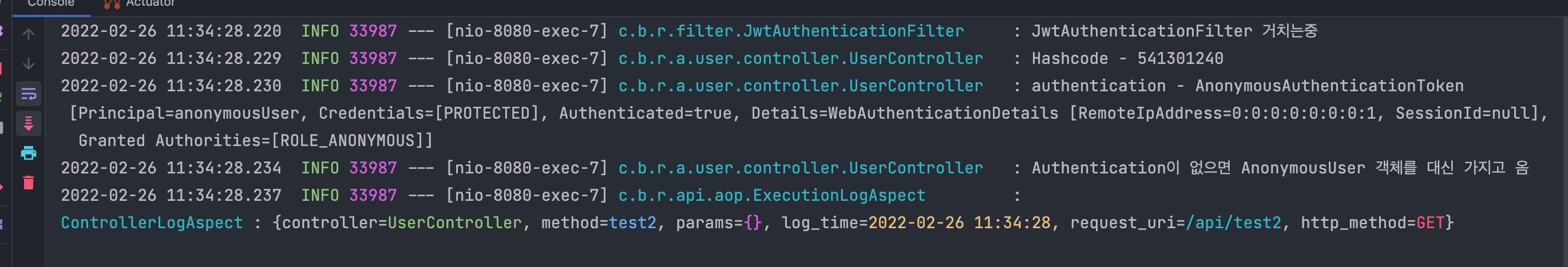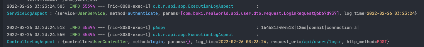 밑에 보면 AOP(Aspect)에서 컨트롤러, 서비스단에서의 정보들을 로깅하고있는 것을 볼 수 있다.