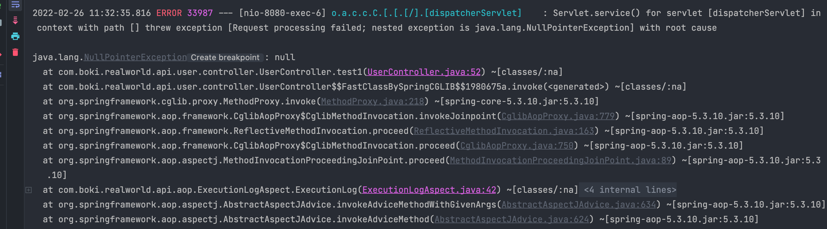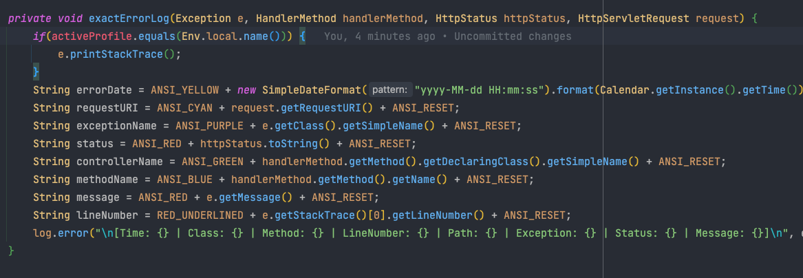 log.error("\n[Time: {} | Class: {} | Method: {} | LineNumber: {} | Path: {} | Exception: {} | Status: {} | Message: {}]\n", errorDate, controllerName, methodName, lineNumber, requestURI, exceptionName, status, message);
