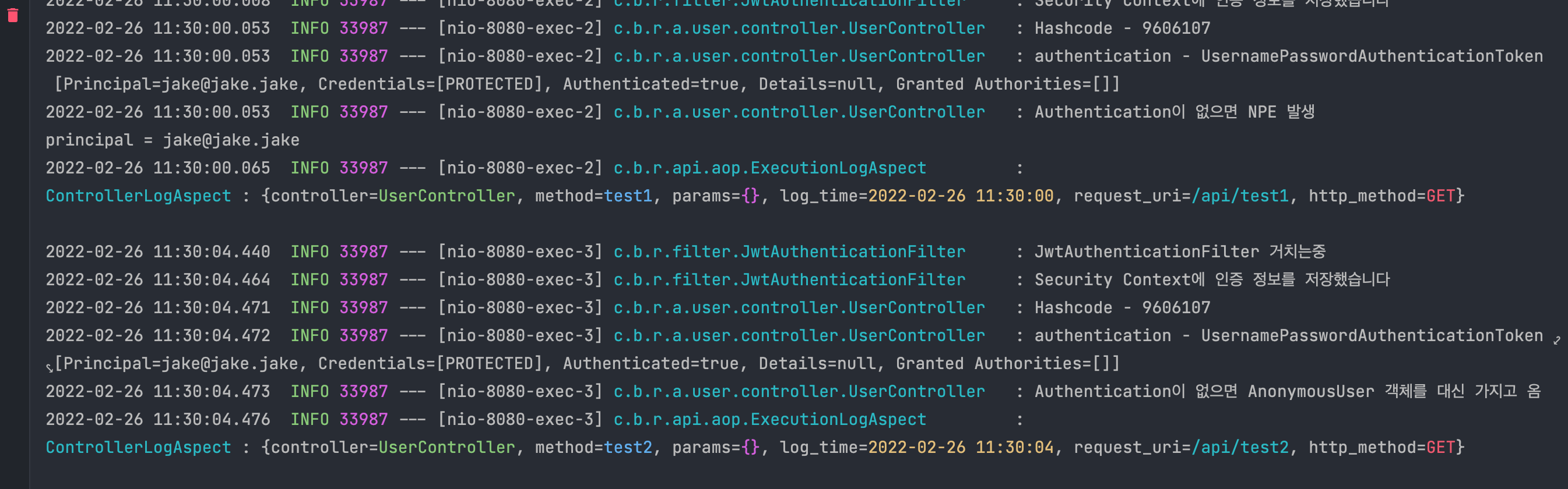 그럼 마지막으로, 토큰과 함께 api test1과 미인증 상태로 api test2의 해시코드는 같을까? 아마 당연히 다를 것 같다