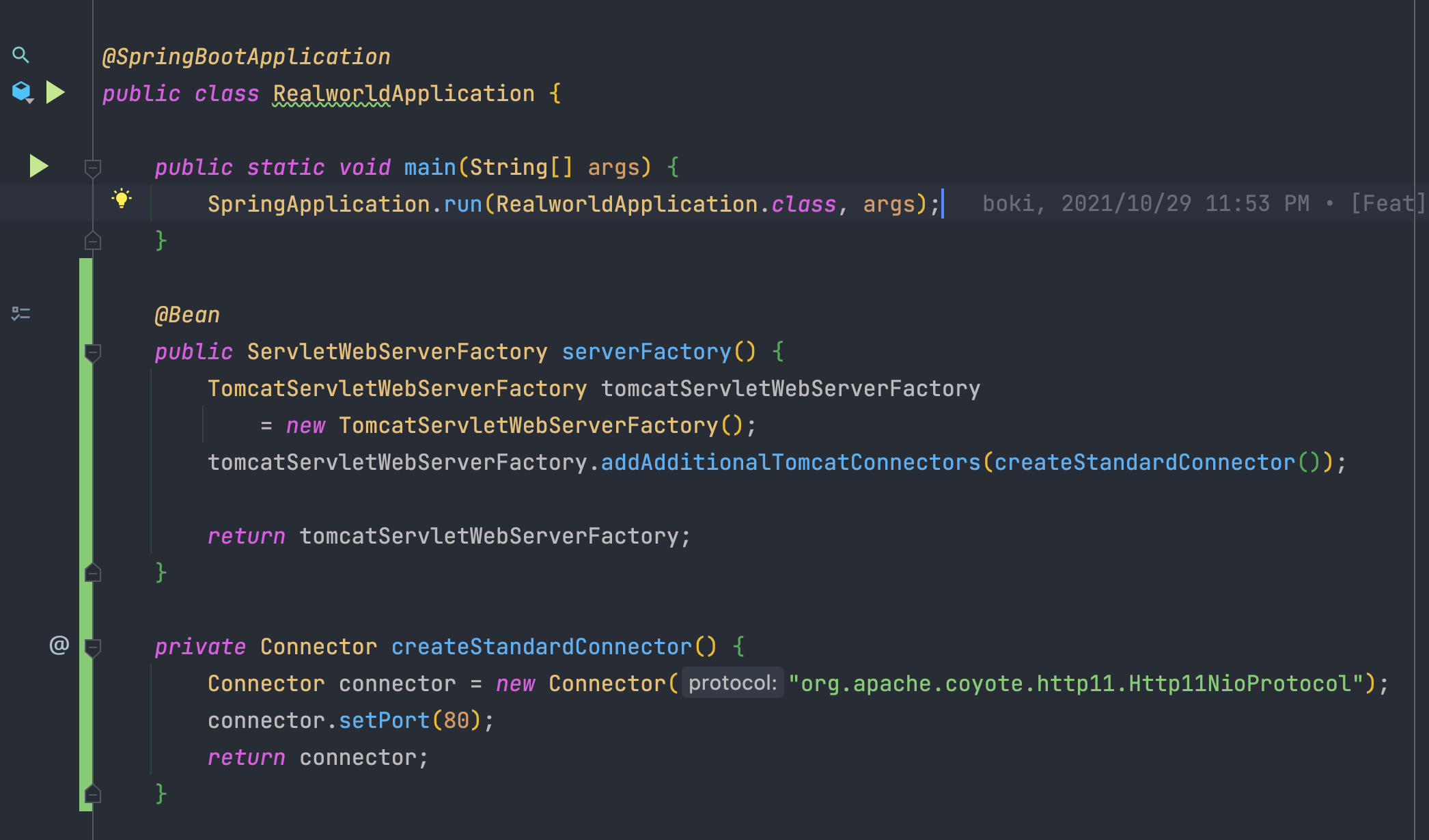 그리고 @SpringBootApplication이 붙어있는 메인스택프레임 밑에 빈 설정을 추가해준다(초록색 쳐져있는 줄 부분)