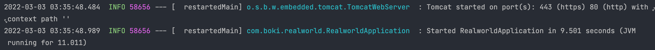INFO 58656 --- [ restartedMain] o.s.b.w.embedded.tomcat.TomcatWebServer : Tomcat started on port(s): 443 (https) 80 (http) with context path ''