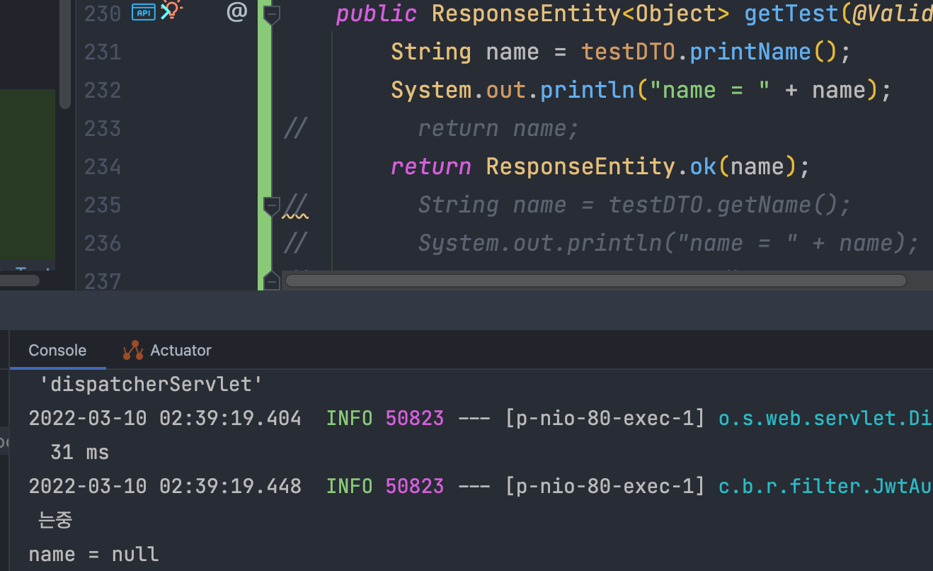 컨트롤러단에서 이름을 받아오니 null이 들어온다