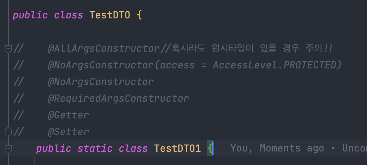 답 : 그것은 아니다. 테스트를 할 때 생성자를 이용할 목적으로 기본생성자를 두는 것이다. 또한 추가로 기본 생성자를 쓸 때는 accessLevel을 올려서 사용하는 것이 좋다. DTO와 도메인 클래스를 분리해서 사용할 목적, 특정 요청에는 특정 값만을 변경해야 하기 때문이다
