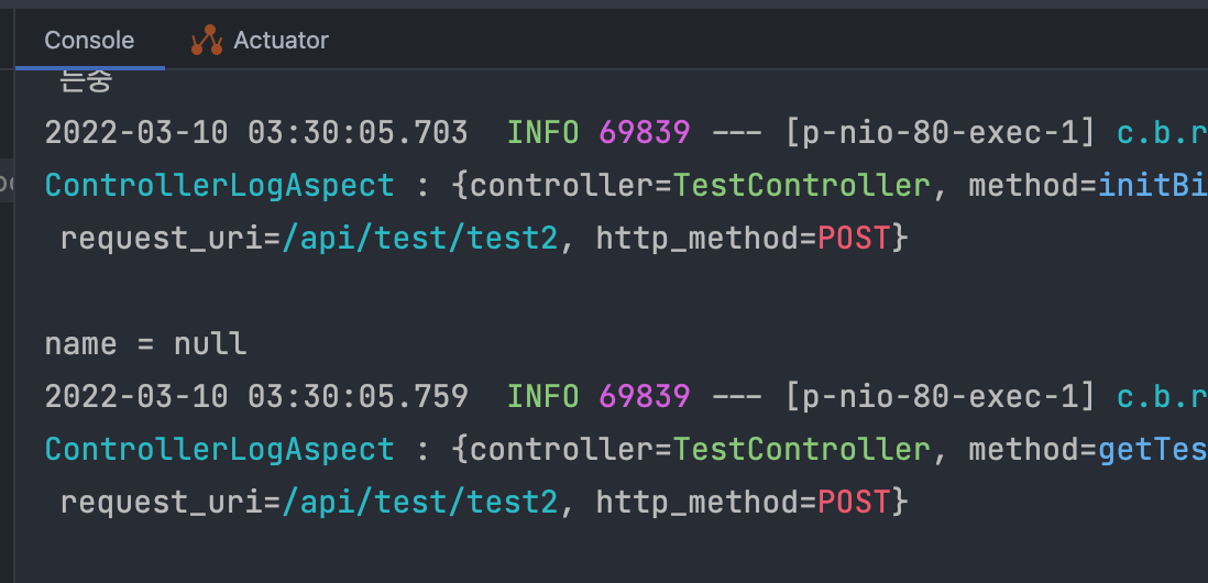 컨트롤러단에서 이름을 받아오니 null이 들어온다