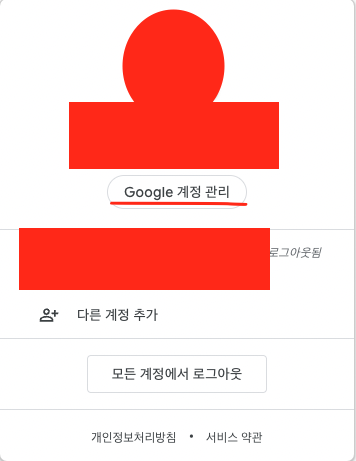1) 구글에 로그인 한 후 오른쪽 위 동그란 프로필을 눌러서 Google 계정 관리에 들어가자