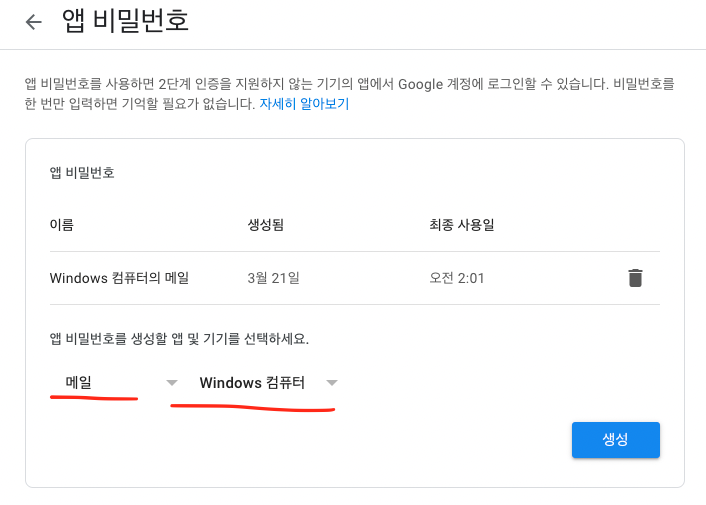 4) 앱 비밀번호를 클릭해서 - 메일 / - Windows 컴퓨터를 선택한다