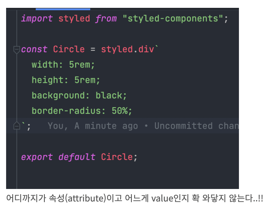 InetlliJ나 WebStrom으로 개발할때 Styled-component를 설치하면 아래처럼 색깔이 입혀지지 않아서 나온다 어디까지가 속성(attribute)이고 어느게 value인지 확 와닿지 않는다..!! 그럴때는 이 플러그인을 설