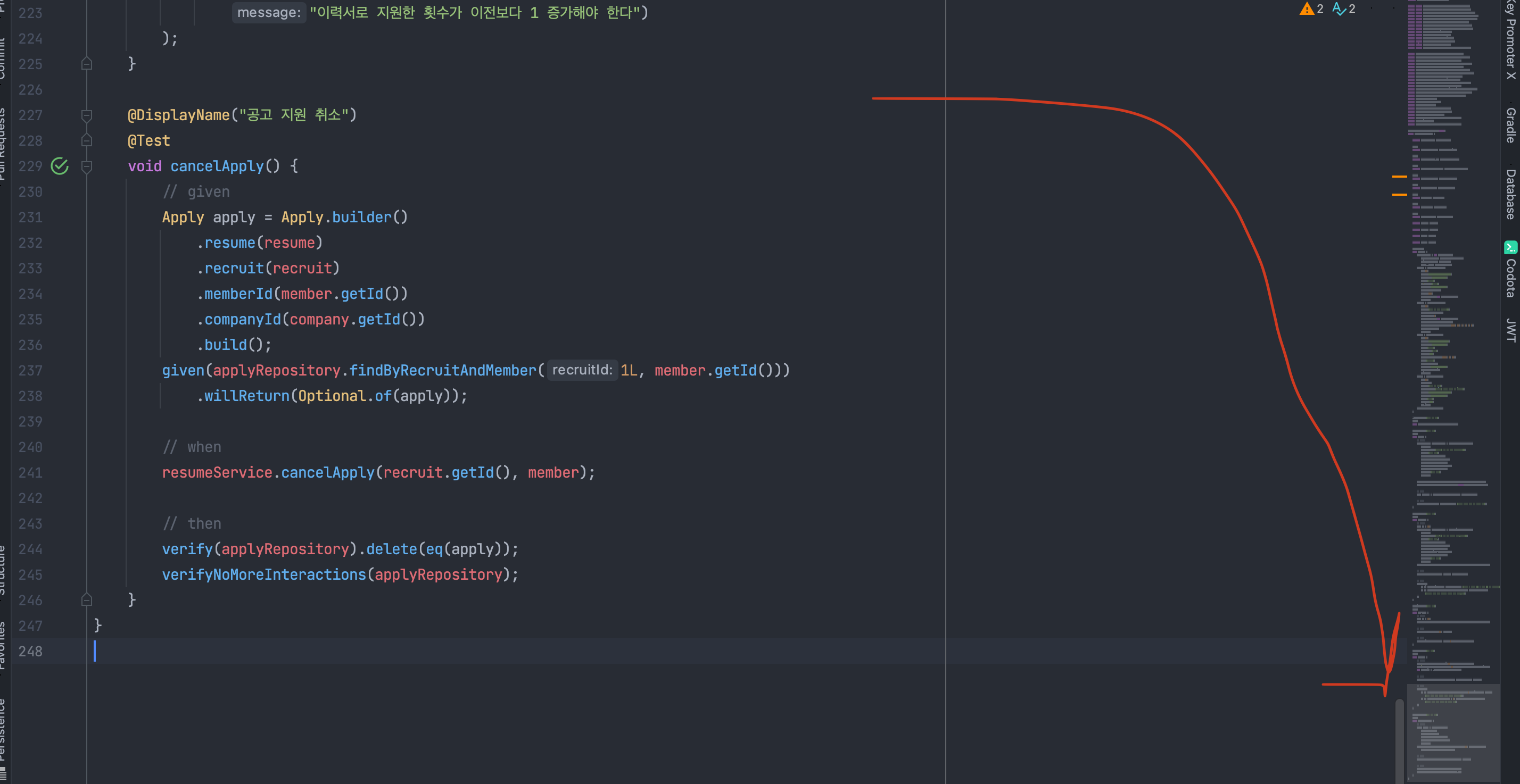 가령 248줄 짜리의 테스트 코드는 코드에서 내려가서 금방 원하는 위치로 갈 수 있지만 예시로 보면 우측에서