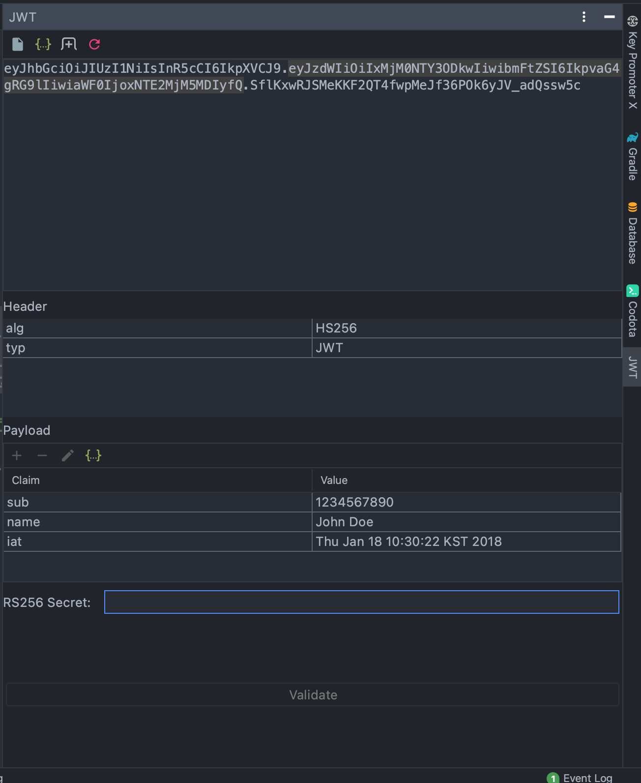이건 모르는 사람들이 은근 많을 것 같다.. Json Web Token 줄여서 jwt(이라 쓰고 존맛탱이라고 읽고싶어진다..)은 보통 jwt.io에서 풀어서 볼때가 있다. 하지만 우린 ide에 의존적(?)이기 때문에 ide 플러그인을 잘 써보자