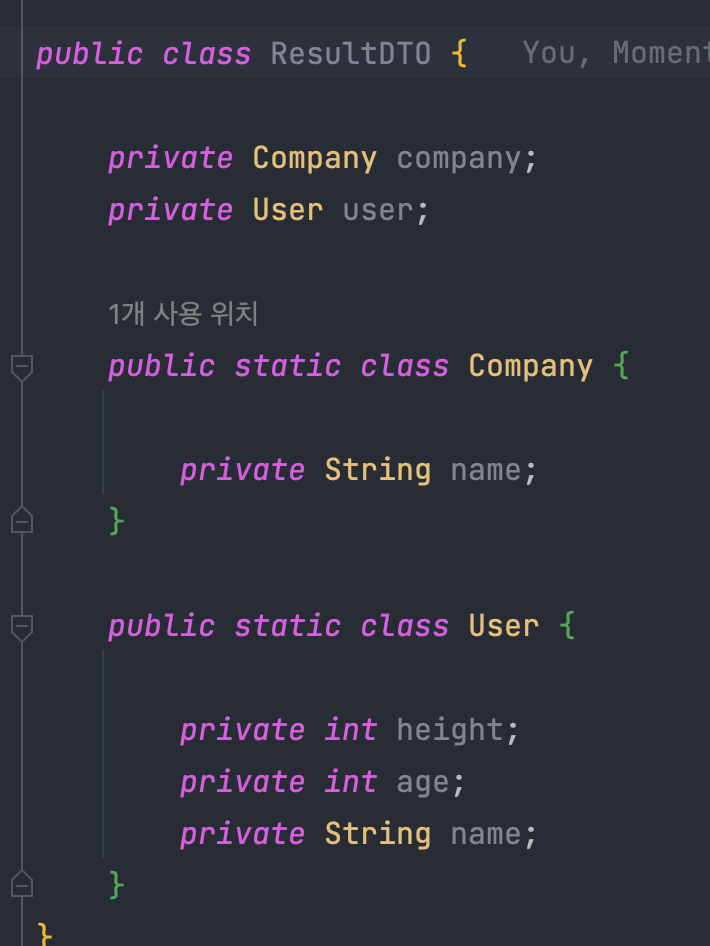 이너클래스로 구성 / 각각의 오브젝트를 파일로 분리해서(여러 DTO 생성)