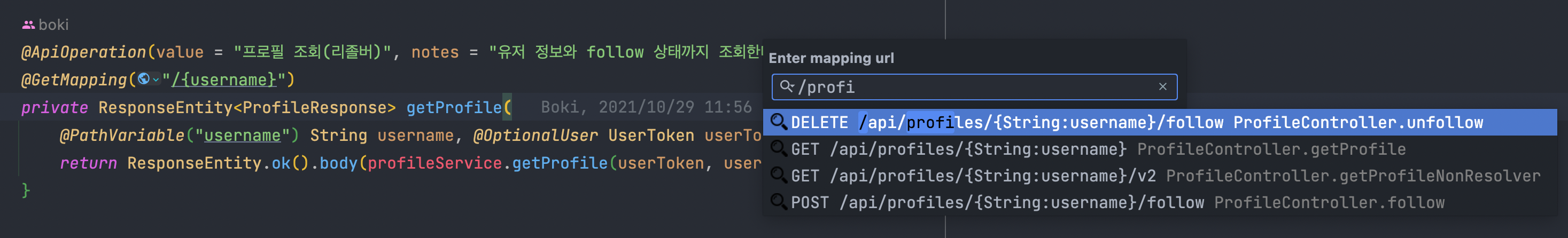 내가 최근에 만든 api가 GET /user/....뭐시기였던거는 기억이 나는데 이거를 파일로 찾거나(Shitft * 2), 전체 검색(Ctrl/Command + Shift + F)로 찾자니 너무 패키지에 자바 파일이 많은거다...