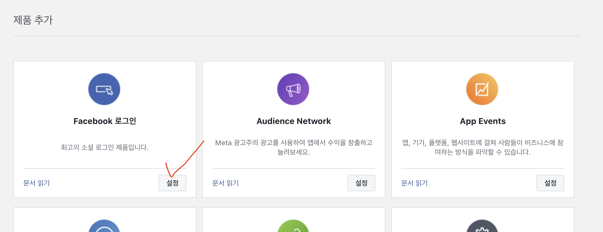 테스트 앱에서 대시보드가 눌러진 상태로 스크롤을 내려서 Facebook 로그인 설정을 누르자