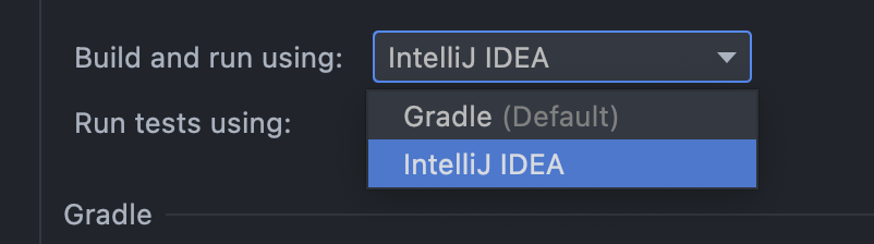 Build and Run 에서 Build and run using, Run tests using이 디폴트인 Gradle로 되어있는 것을 IntelliJ IDEA로 둘다 바꿔주자