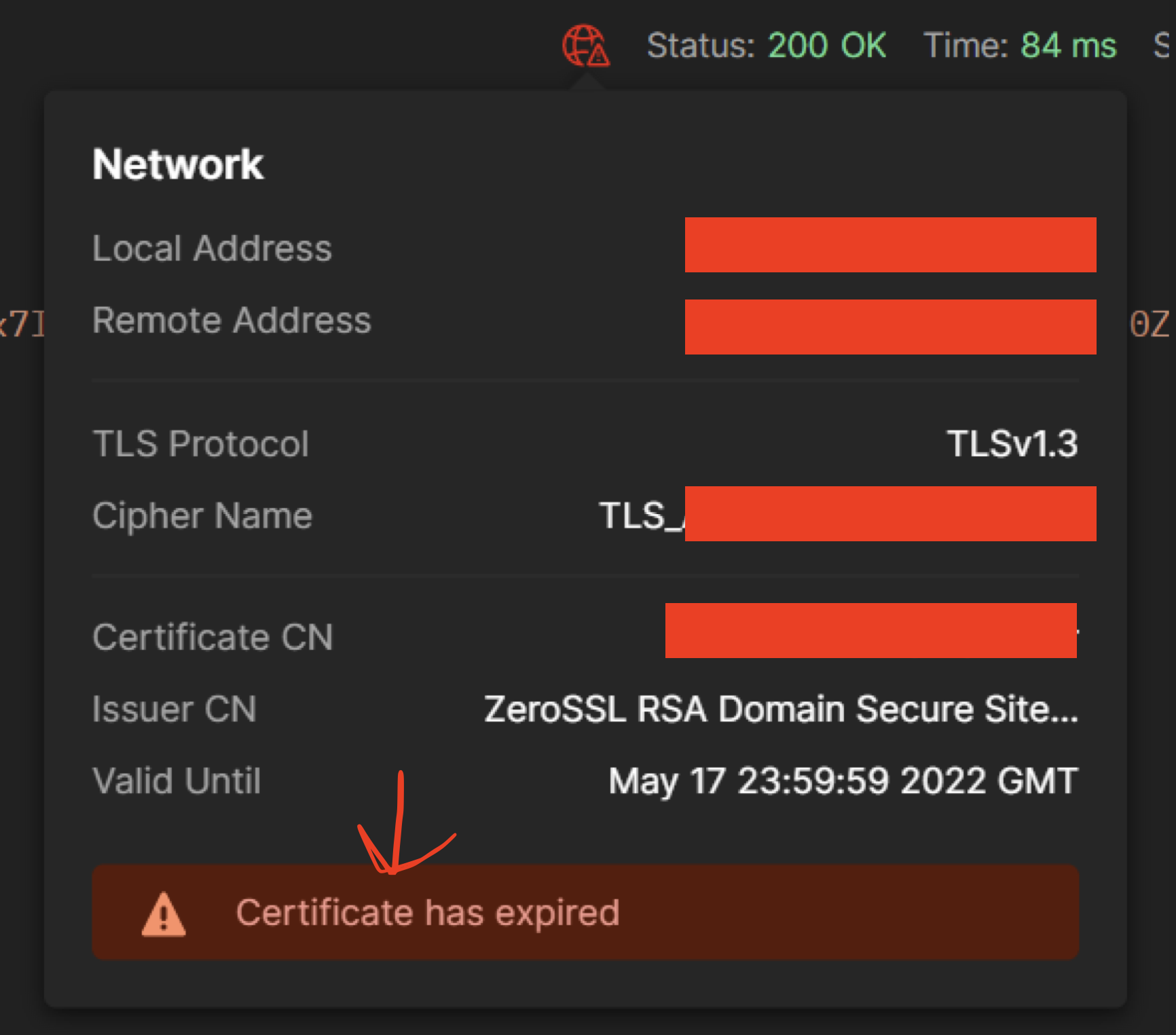 상태는 200이었지만, 빨갛게 표시가 되고 맨 아래에 인증서가 만료되었다라고 표시가 뜬다