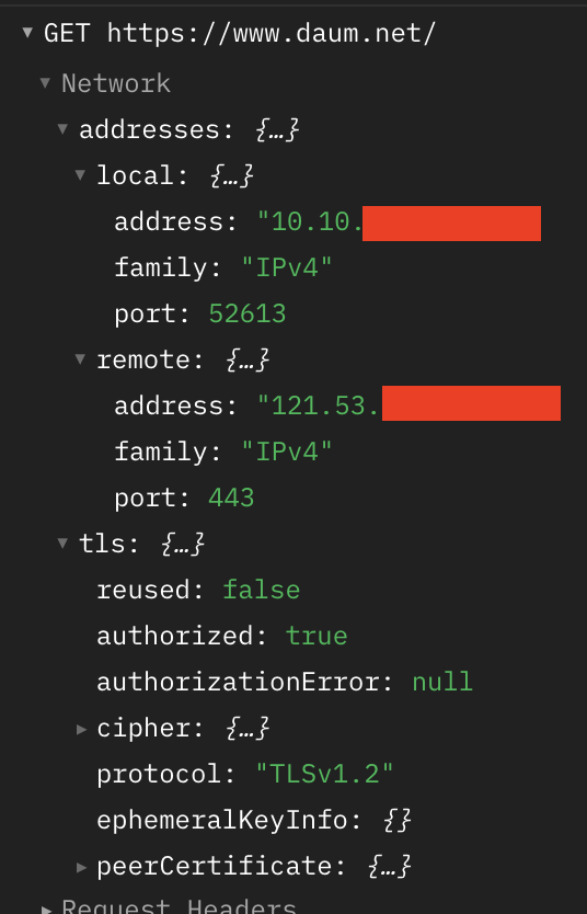 https로 요청을 보냈기때문에 TLS or SSL 레이어가 붙어있고, IP주소도 나와있다