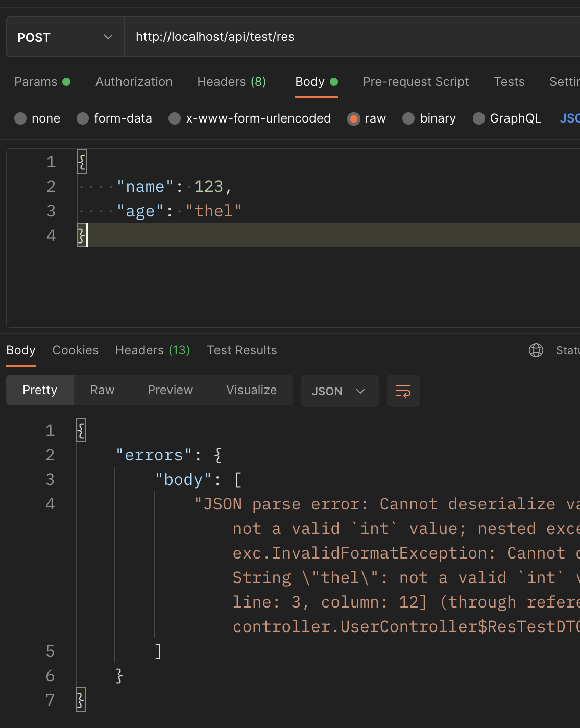 를 보내면 오류가 뜬다고 (물론 실전에서는 훨씬 더 복잡할것이다. 서비스 로직을 타고 디비를 거쳤다 나오고 해야하니깐)