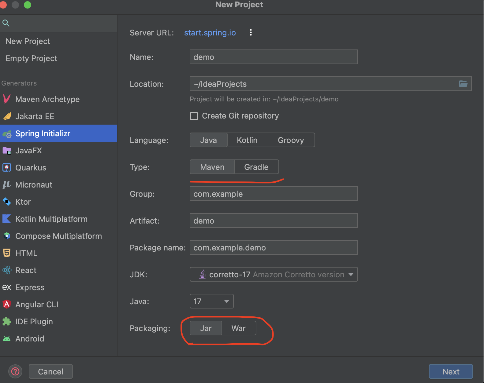 우선 프로젝트를 만들때 Spring initializer로 만들면 IDE가 배포 패키징(아카이빙)을 WAR로 할지, JAR로 할지 선택하라고 한다