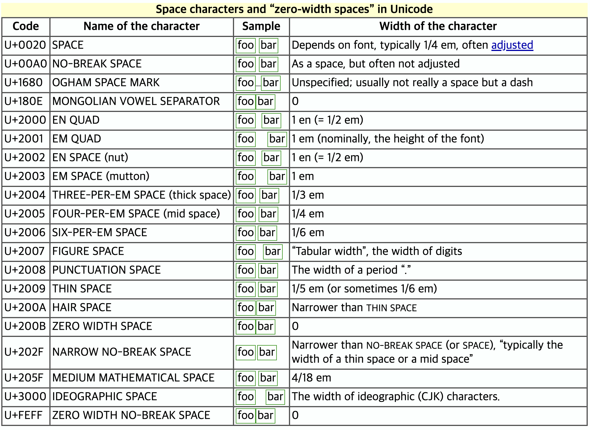 This document lists the various space characters in Unicode. For a description, consult chapter 6 Writing Systems and Punctuation and block description General Punctuation in the Unicode standard. This document also lists three characters that have no wid