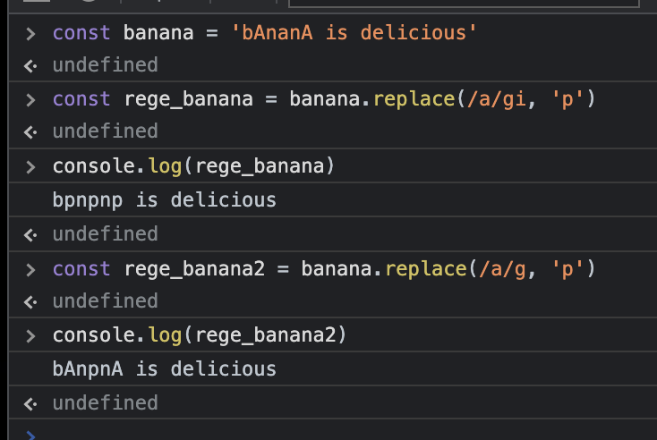 1번 정규식 패턴에서 '대신 /로 사용하고 뒤에 g 옵션(global)을 붙이면 전체 스트링에 대해서 패턴매칭을 진행한다