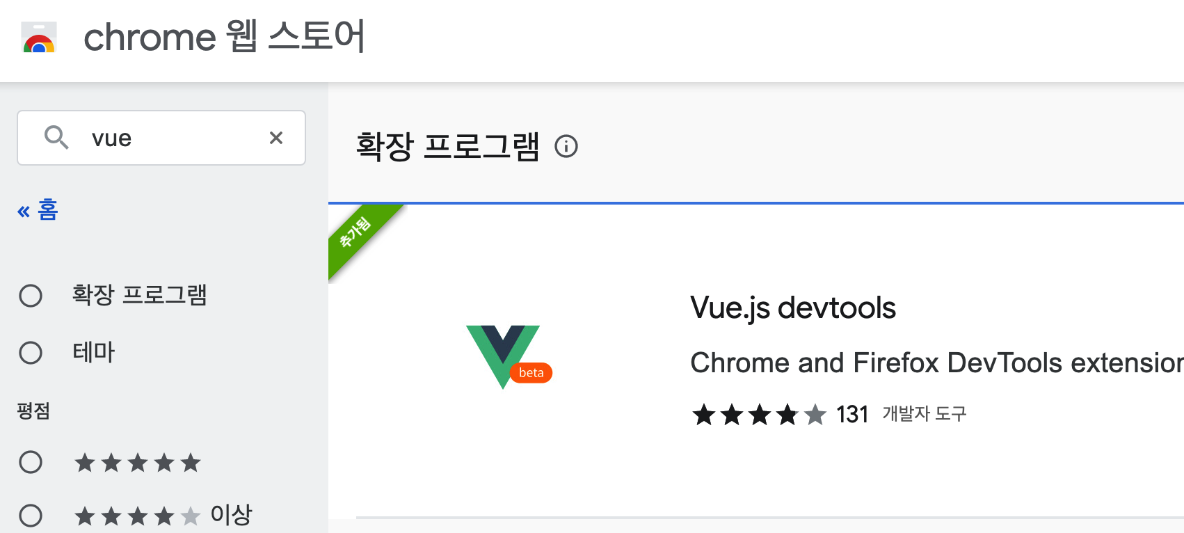 크롬 확장프로그램 웹스토어에서 Vue.js devtools를 검색해서 설치하자
